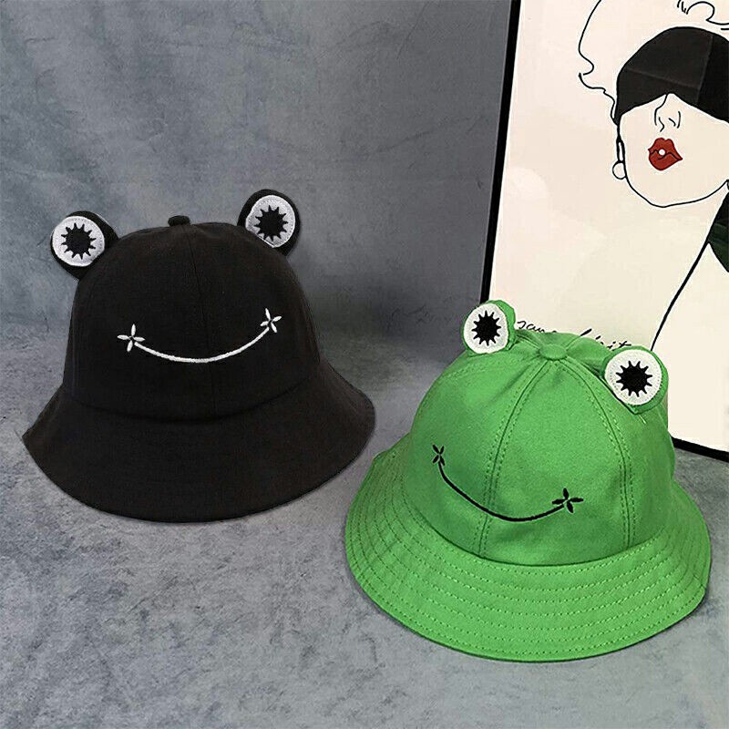 Cute Frog Bucket Hat Cotton Fisherman Sun Protector Cap - Black.